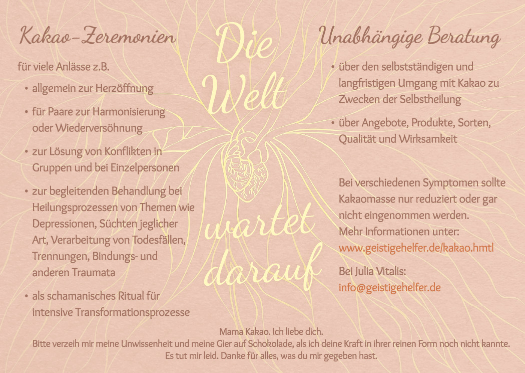 Ansonsten finden Sie viel Wissenswertes im Text unter dem Video, warum ich Kakao als „schamanische Medizin“ nutze und meine Angebote auf dem Flyer selbst.